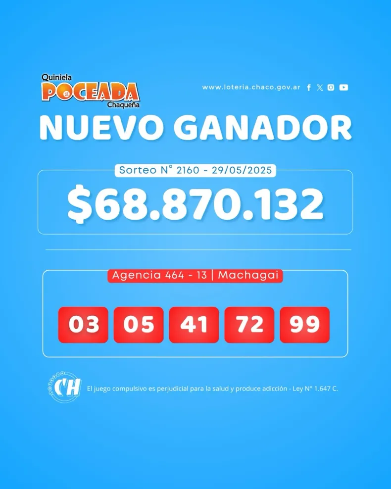 El sorteo N° 2160 de La Poceada de este jueves dejó a un nuevo multimillonario en la provincia. En esta ocasión, un jugador se hizo de un pozo de $ 68.870.132, tras acertar los cinco números del ticket. Para este sábado se estima un premio que supera los 38 millones de pesos.