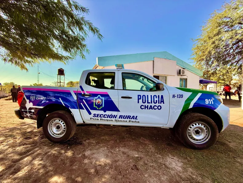 El gobernador Leandro Zdero junto al intendente de Presidencia Roque Sáenz Peña, Bruno Cipolini y al ministro de Seguridad, Hugo Matkovich, entregó un vehículo destinado a la Policía Rural del destacamento "La Chiquita".