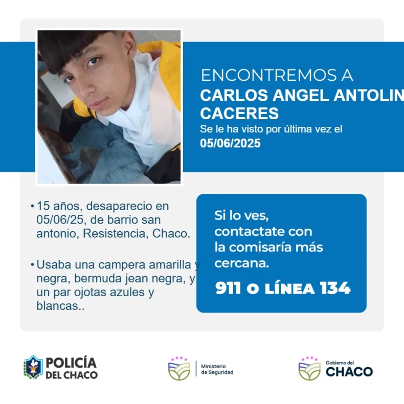 La familia del menor Carlos Ángel Antolin Cáceres de 15 años, denunció su desaparición en la Comisaria Quinta Resistencia, ahora la Policía lo busca intensamente y solicita a la ciudadanía su colaboración para hallarlo.