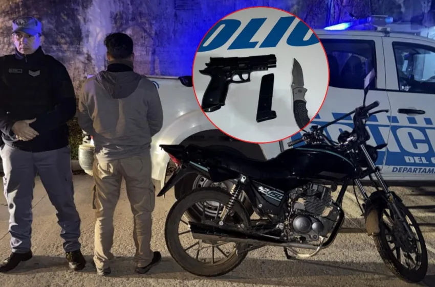 El joven de identificó como A.P.B. y dijo desempeñarse como motouber, los agentes constataron que el ciudadano tenía en su poder una pistola de aire comprimido tipo réplica, marca Fox calibre 6 mm, de color negro, con un cargador sin municiones, además de una navaja de 15 centímetros, marca Trento. El sujeto no pudo justificar la tenencia de estos elementos, los cuales fueron formalmente secuestrados junto a la motocicleta en la que se movilizaba, una Motomel 150cc de color negro, sin patente visible.