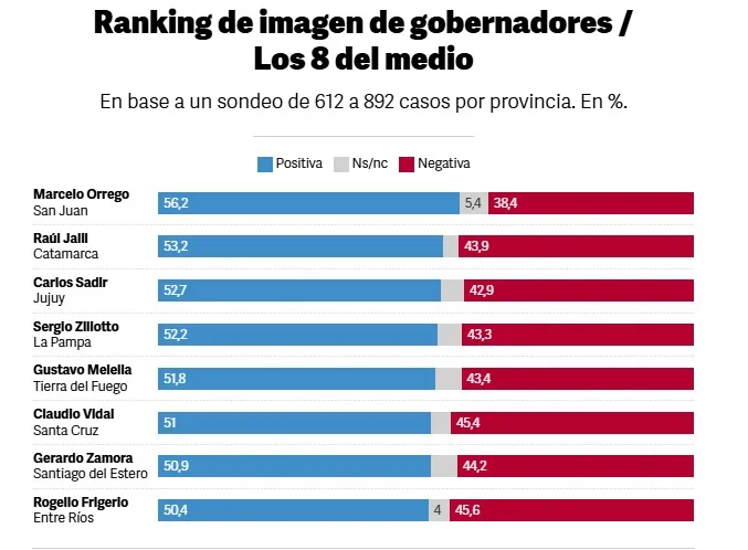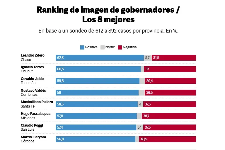 En el podio de este mes, además de Zdero, figuran Ignacio "Nacho" Torres (Chubut), del PRO, con un 60,5% de imagen positiva, y Osvaldo Jaldo (Tucumán), peronista cercano al oficialismo nacional, con un 59,8%.