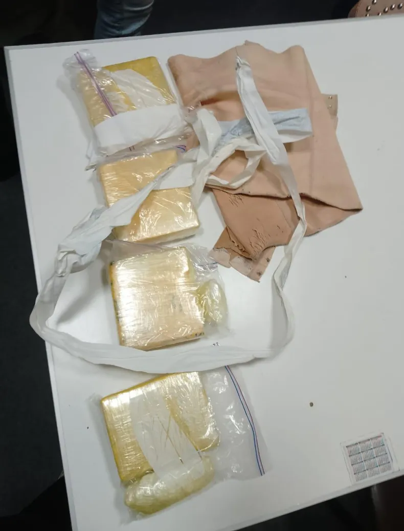 Durante el control, una pasajera mayor de edad evidenció un llamativo estado de nerviosismo, por lo que fue sometida a una requisa más exhaustiva con apoyo del perro detector de narcóticos "Helena". La inspección confirmó que la mujer llevaba cuatro paquetes rectangulares y dos amorfos adosados al abdomen.