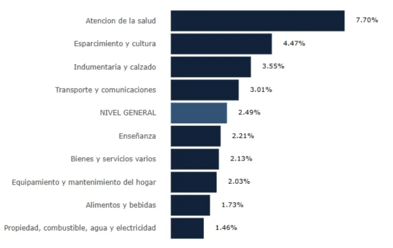 Alimentos y bebidas subió 1,73%, pero sigue siendo el capítulo con mayor incidencia, explicando casi el 30% del aumento mensual. Dentro de este rubro, lo que más impactó fueron carnes, productos de panificación, almuerzos y cenas.