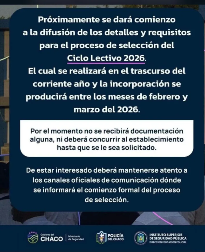 Este martes por la mañana, desde la Policía del Chaco emitieron un comunicado oficial en el que aclaran que próximamente se difundirá la información detallada sobre requisitos y cronograma del proceso de selección correspondiente al Ciclo Lectivo 2026. En el documento se indica que el proceso se desarrollará durante el transcurso del presente año y que la incorporación de los seleccionados será entre febrero y marzo de 2026.
