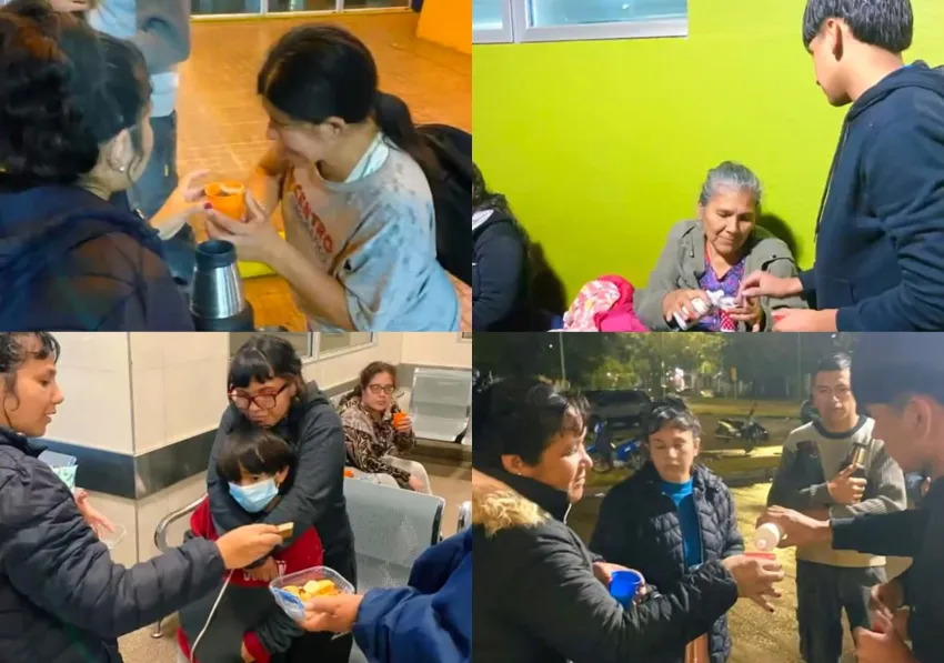 Los jóvenes se acercaron al Hospital Perrando de Resistencia en medio de una noche muy fría y le dieron a los pacientes y las familias que acompañan un vaso con una bebida caliente con bizcochos y dulces.