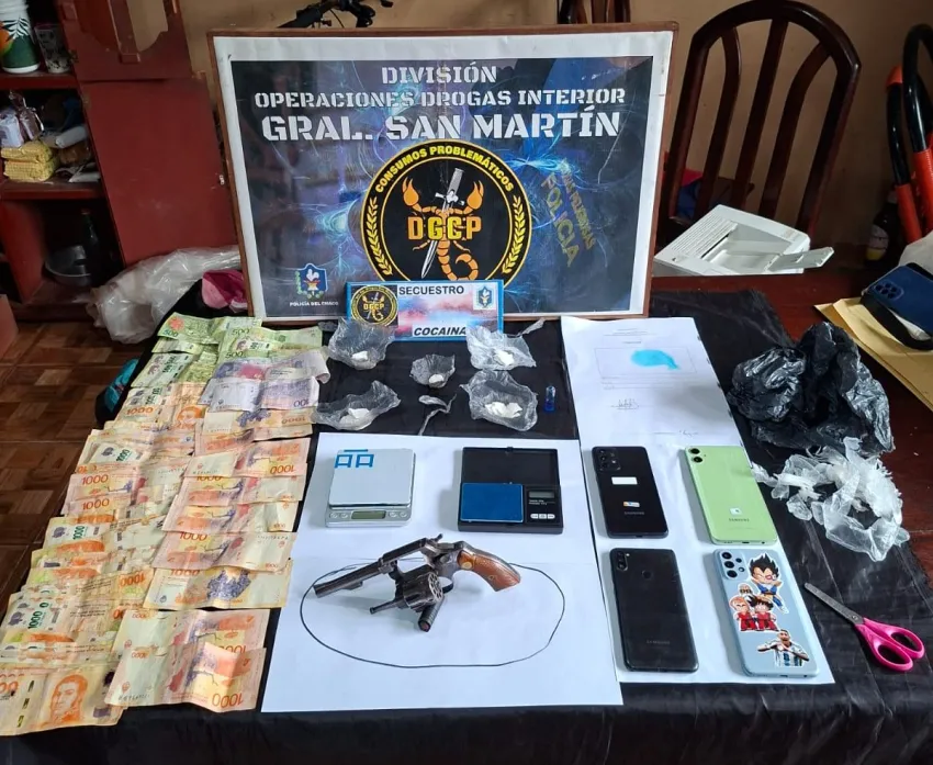 En el primer domicilio, ubicado en calle Suipacha sin número, se incautaron cinco envoltorios de cocaína (con un peso total de 39,4 gramos), dos balanzas de precisión, recortes de polietileno, una tijera, cuatro teléfonos celulares Samsung, $52.300 en efectivo, y un revólver calibre .22 marca Rubiertra con nueve alveolos, sin municiones.