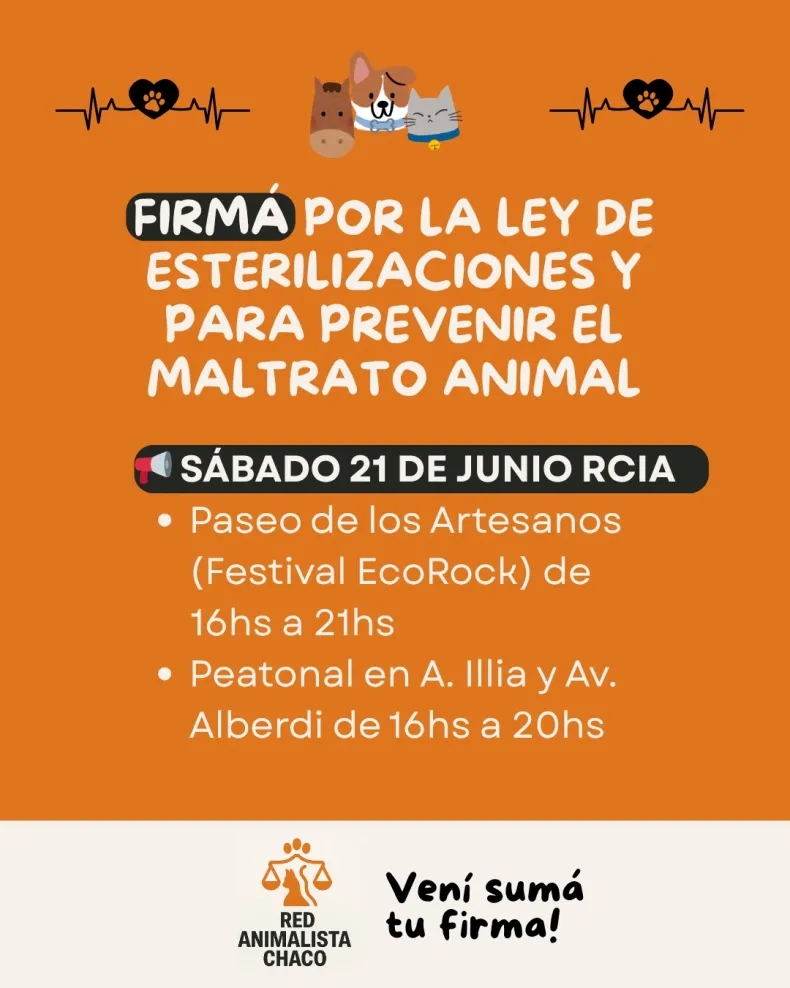 Este sábado 21 de junio se realizará en Resistencia una jornada solidaria para promover el bienestar animal. En dos puntos de la ciudad se reunirán firmas a favor de una ley de esterilizaciones masivas, sistemáticas, tempranas y gratuitas, además de impulsar acciones contra el maltrato animal.