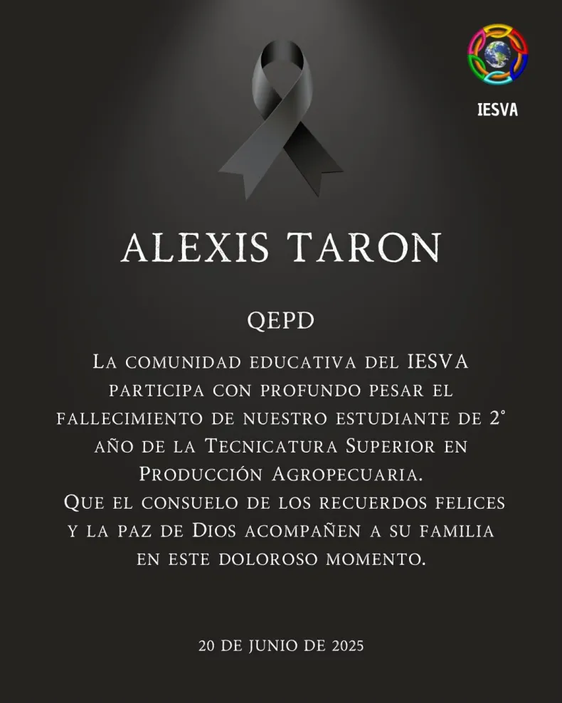 La comunidad educativa del IESVA participa con profundo pesar el fallecimiento de nuestro estudiante de 2° año de la Tecnicatura Superior en Producción Agropecuaria.