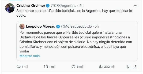 El reclamo de la exmandataria se dio luego de que presentara una solicitud formal ante la Justicia para que se levanten las limitaciones impuestas sobre las personas que pueden visitarla en su casa. Según expresó, estas condiciones afectan su libertad política y buscan interferir en su participación pública. "En la Argentina hay que explicar lo obvio", escribió, en alusión a lo que considera una maniobra judicial con fines políticos.