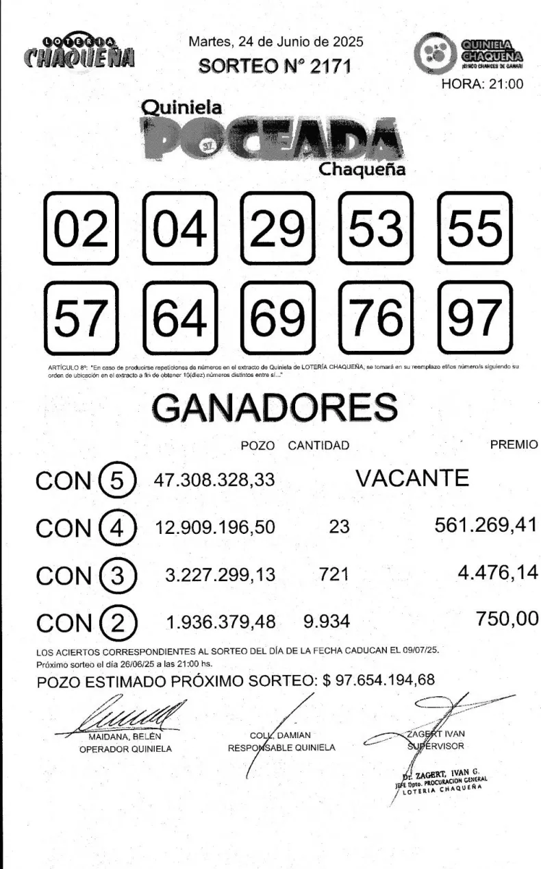 En el sorteo N° 2171 de martes, la Poceada volvió a quedar vacante y acumula un llamativo pozo de $ 97.654.194 millones. Los números salieron fueron: 02,04,29,53,55,57,64,69,76 y 97.
