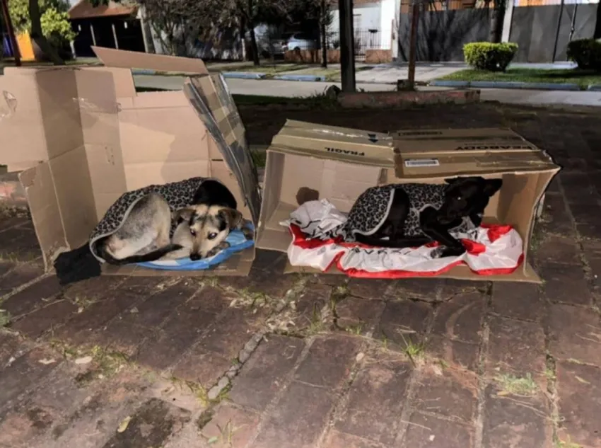A través de una publicación por redes sociales, una usuaria difundió una foto donde se ve a dos perros callejeros durmiendo en cajas de cartón y en el piso bajo temperaturas extremas: "Necesitamos la ayuda de todos para poder darles un hogar a los dos hasta que encuentren una familia que los adopte", expresa el posteo de Facebook.