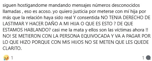En redes sociales, Marlene expresó su desesperación: "Quiero justicia por mi hija. Me están hostigando con mensajes y llamadas desde números desconocidos. Ella casi me la mata y ahora se hacen las víctimas. ¡Con mis hijos no se meten!".