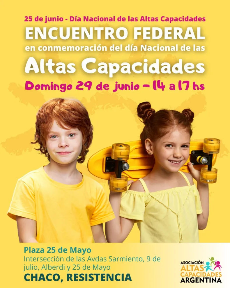 Este sábado 28 y domingo 29 de junio se realizará el Encuentro Federal por las Altas Capacidades, organizado por la Asociación Civil Altas Capacidades Argentina. Con el lema "Pintar el país de amarillo", se busca concientizar sobre esta condición que alcanza al 15 % de la población, con actividades recreativas, talleres e intervenciones en espacios públicos de varias provincias.