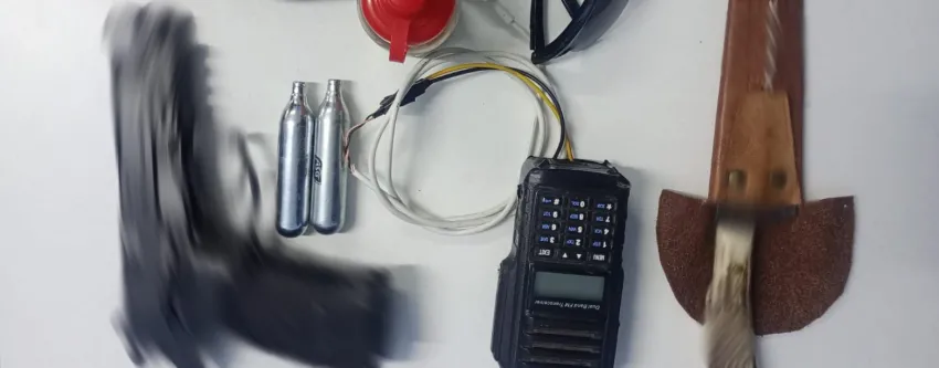 Durante la inspección del lugar, la mujer encontró entre las pertenencias del acusado varios elementos que entregó voluntariamente por temor: una pistola de CO2 estilo Bersa Thunder Pro 9x19 mm con cargador, dos garrafas de balines metálicos, un portapistola verde militar, un tarro con balines, un cuchillo de hoja metálica de 32 cm, un anteojo de sol negro y un radio portátil marca Baofeng.