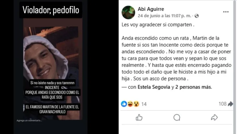 Además, Abigail Aguirre, la madre de la damnificada, publicó una foto del acusado en sus redes sociales donde expuso: "Anda escondido como una rata, Martin De la Fuente si sos tan Inocente como decís porque te andas escondiendo. No me voy a casar de poner tu cara para que todos vean y sepan lo que sos realmente. Y hasta que estés encerrado pagando todo el daño que le hiciste a mis hijos, a mi hija. Sos un asco de persona.", escribió.