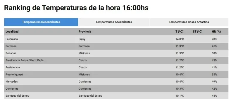 Durante la mañana del lunes, la mínima fue de 5.6°C en la capital chaqueña y de 5.3°C en la ciudad termal. Para la siesta, ambas localidades registraban una temperatura de 11.2°C, con humedad entre el 41% y 43%.
