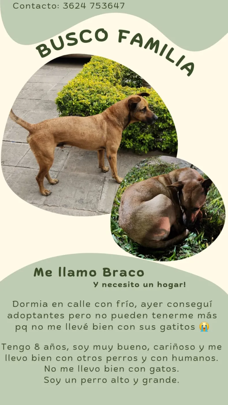 Braco es un perro grande, de tamaño alto. Es muy bueno, cariñoso, se lleva bien con otros perros y con personas, pero no convive bien con gatos. Actualmente, sigue esperando una familia que lo cuide y le brinde un techo.