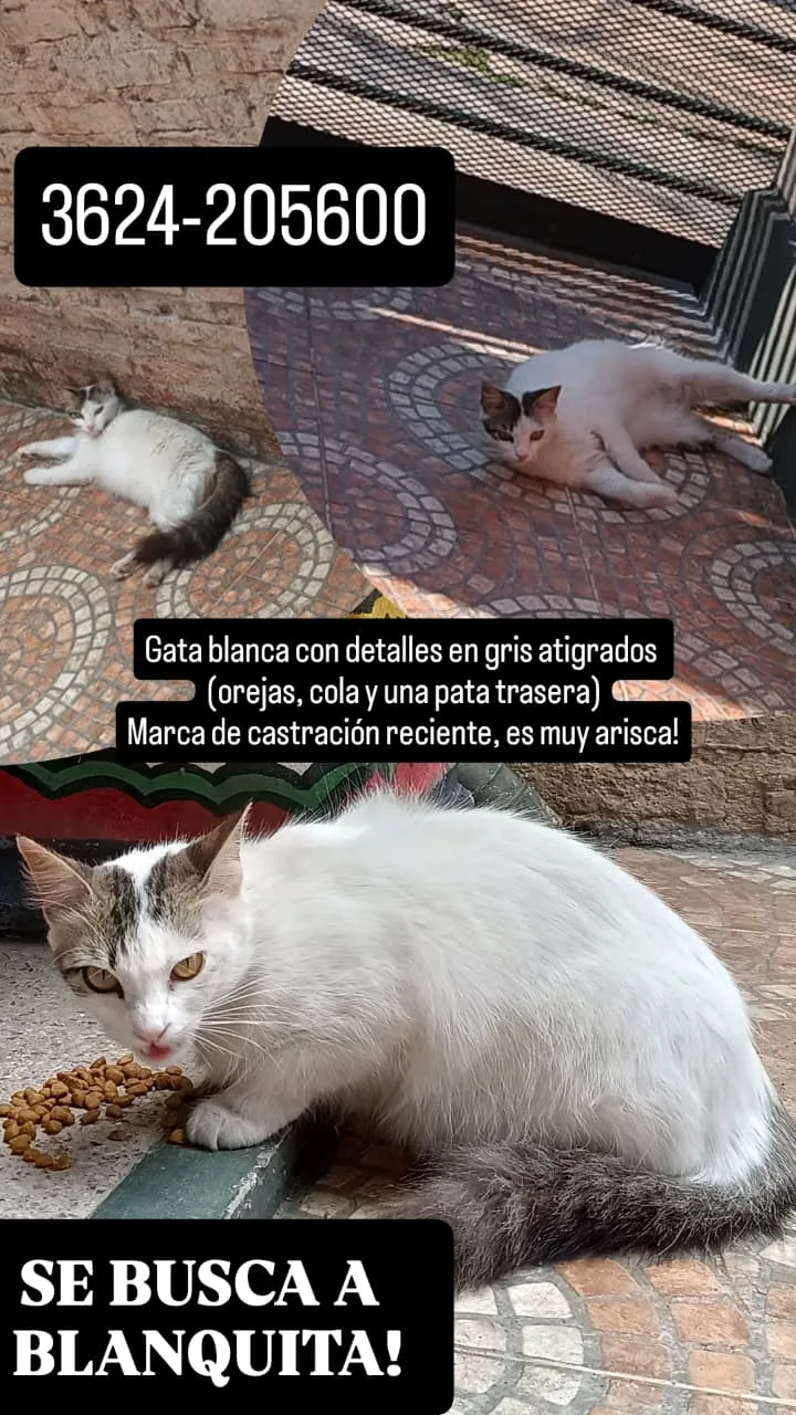 Una vecina del barrio Llaponagat de Resistencia busca desesperadamente a su gata, una felina comunitaria de pelaje blanco con detalles gris atigrado en orejas, cola y una pata trasera. La gata, que fue castrada recientemente, desapareció durante la noche del viernes 6 de junio y desde entonces no se han tenido novedades sobre su paradero.