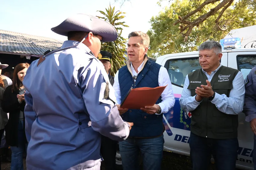 En el marco del Plan Estratégico de Seguridad, el gobernador Leandro Zdero encabezó el domingo 6 de julio la entrega de un vehículo 4x4 a la Policía Rural de General José de San Martín, con el objetivo de fortalecer la lucha contra el delito organizado, el narcotráfico y el abigeato.