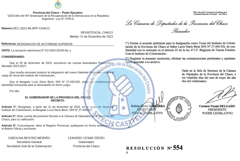 Desde FESICH SITECH Castelli denuncian que "en el Chaco de Zdero, los cargos públicos parecen tener efectos milagrosos. El caso de Lucio Darío Beck que tras 18 meses de licencia por largo tratamiento porque su salud no le permitía enseñar, hoy lo vemos en perfectas condiciones como Vocal del Instituto de Tierras Fiscales. Radiante, enérgico y listo para los beneficios del poder".