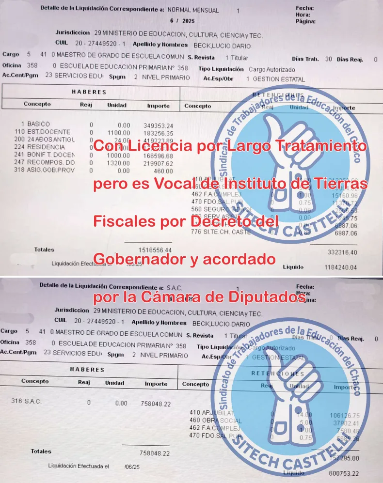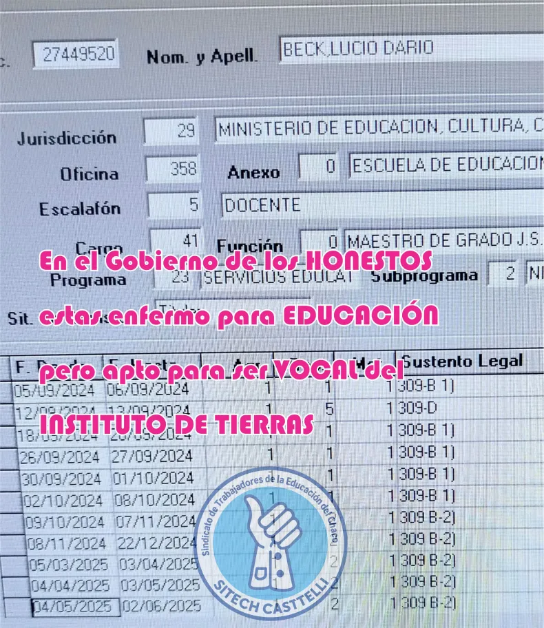 Además, aseguraron que Beck sigue cobrando su salario docente gracias a una licencia interminable. "Nada mal: dos sueldos, cero problemas", señalan con indignación desde FESICH SITECH Castelli.