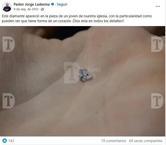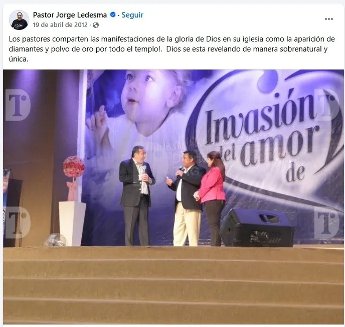 Entre los testimonios que más controversia generan, Ledesma asegura haber presenciado apariciones de "polvo de oro" y diamantes en medio de sus prédicas. En un video viralizado recientemente, incluso afirma que un anillo de plástico se transformó en uno con diamantes mientras oraban. "Las piedritas comenzaron a transformarse una por una", dice el pastor en una grabación que circula desde 2011.