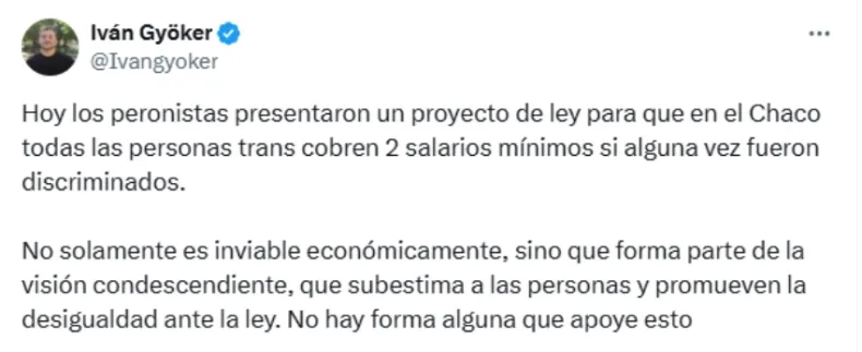 El diputado Iván Gyöker, desde el oficialismo, cuestionó el proyecto a través de la red social X. "No solamente es inviable económicamente, sino que forma parte de una visión condescendiente, que subestima a las personas y promueve la desigualdad ante la ley", expresó.