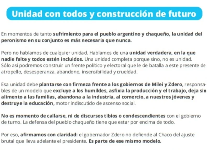 El texto critica con dureza tanto al presidente Javier Milei como al gobernador Leandro Zdero, a quienes señalan como responsables de "un modelo que excluye a los humildes, asfixia la producción y el trabajo, y destruye la educación".