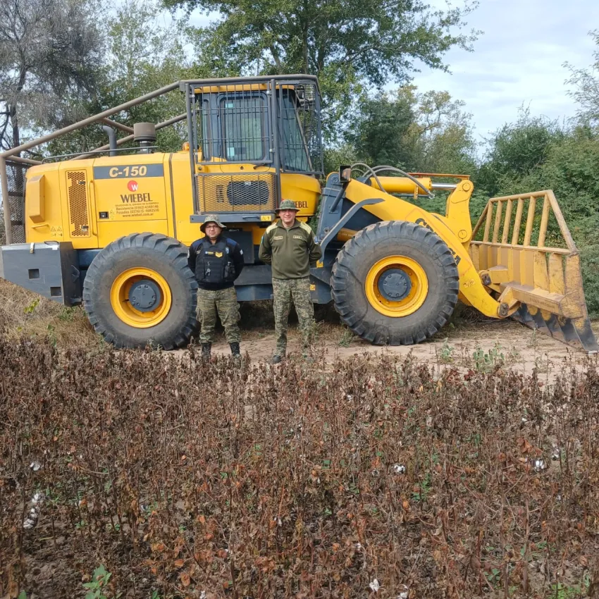 Personal de la Dirección de Bosques, con apoyo policial, secuestró este viernes un tractor pala frontal en un campo ubicado en el paraje India Muerta, departamento Chacabuco, cerca de Charata. La intervención se realizó tras constatar el desmonte de unas 40 hectáreas, el infractor fue identificado como O. G. E. C., domiciliado en zona rural de Las Breñas.