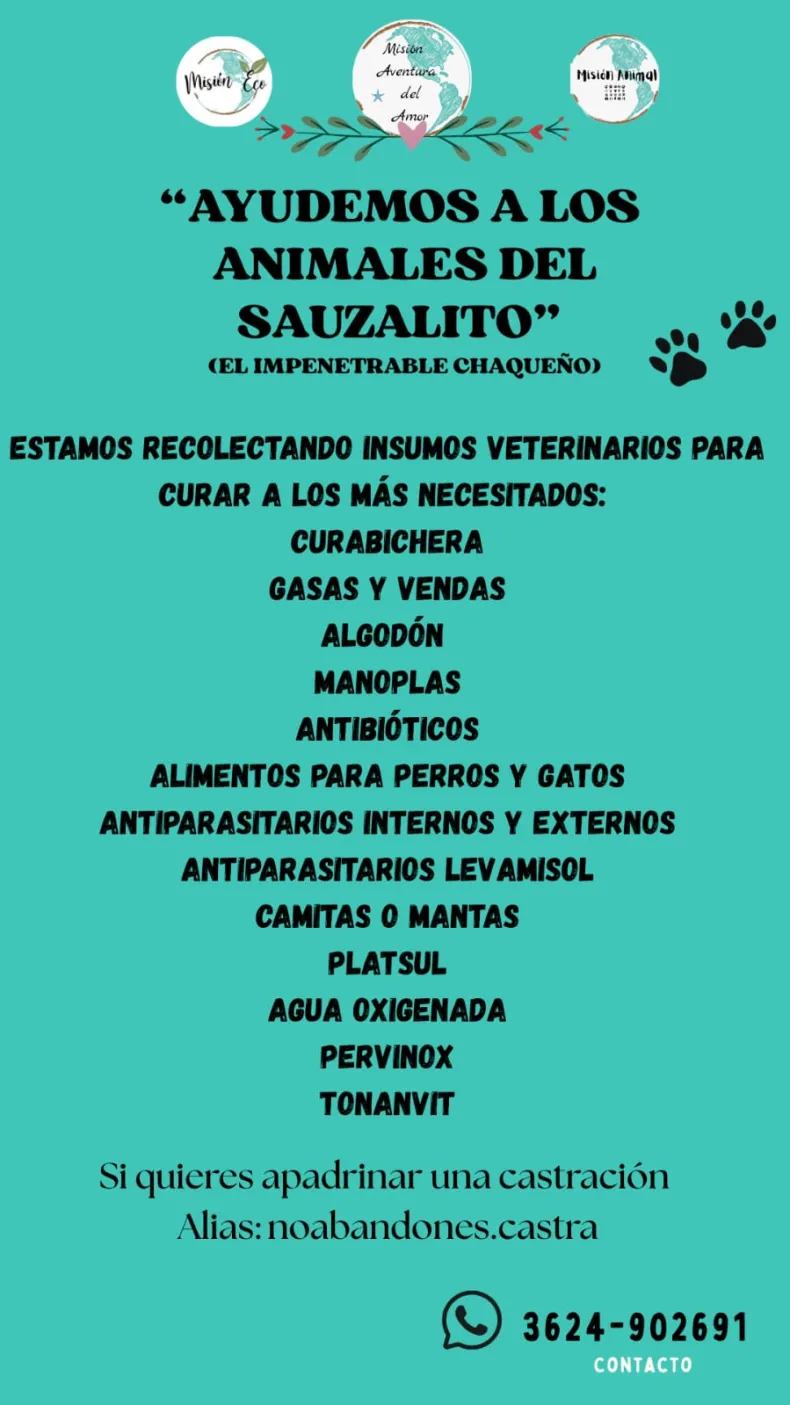 Con el lema "Ayudemos a los animales del Sauzalito", un grupo de voluntarios del Chaco organiza una misión solidaria hacia el Impenetrable chaqueño para el próximo lunes 21 de julio, con el objetivo de asistir a perros y gatos en situación de vulnerabilidad. La iniciativa convoca a la comunidad a colaborar con donaciones, insumos médicos y hasta apadrinar una castración.