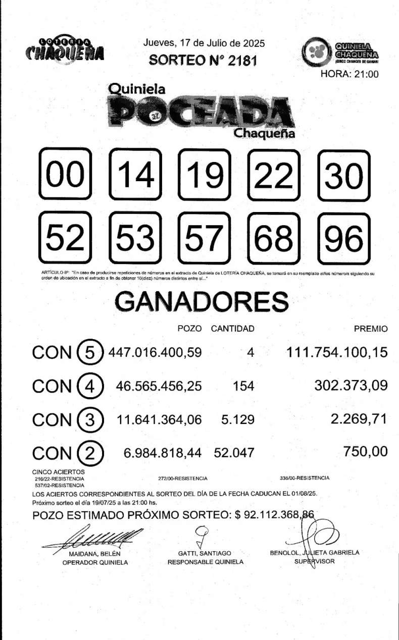 El sorteo N° 2181 de la Quiniela Poceada Chaqueña, realizado el jueves 17 de julio de 2025, dejó una lluvia de millones en la ciudad de Resistencia: cuatro apostadores se alzaron con el primer premio y se repartieron un pozo de $ 447.016.400, llevándose cada uno $ 111.754.100,15.