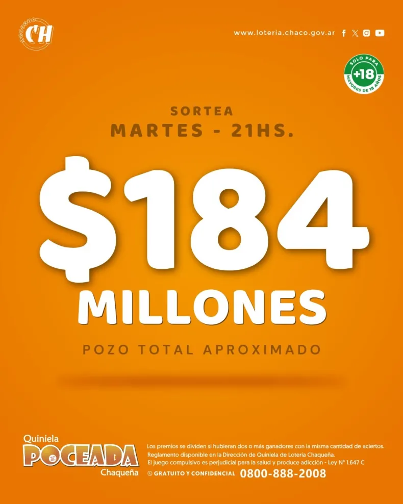 La Poceada Chaqueña quedó vacante el sábado 19 de julio, y el pozo creció a más de $ 184 millones. Es así que, en la noche de este martes, los chaqueños tienen una nueva oportunidad de transformarse en millonarios.