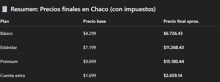 A estos montos se les debe sumar aproximadamente un 51% de impuestos nacionales y, en el caso del Chaco, un 5,5% adicional por impuestos locales. Esto significa que cerca del 56% del pago final de Netflix corresponde a impuestos y percepciones.