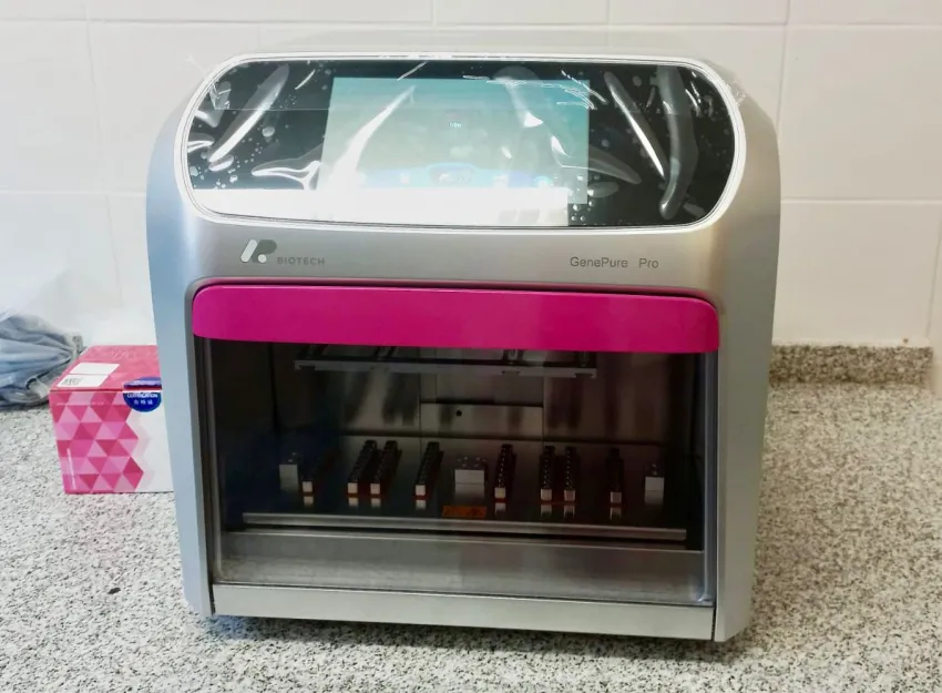 Se trata de un equipo Biotech Gene Pure Pro,que permite la clasificación, separación y purificación de componentes proteicos de manera rápida, eficiente y reproducible.Puede procesar múltiples tipos de muestras, como sangre, suero, tejidos embebidos en parafina y ADN genómico.