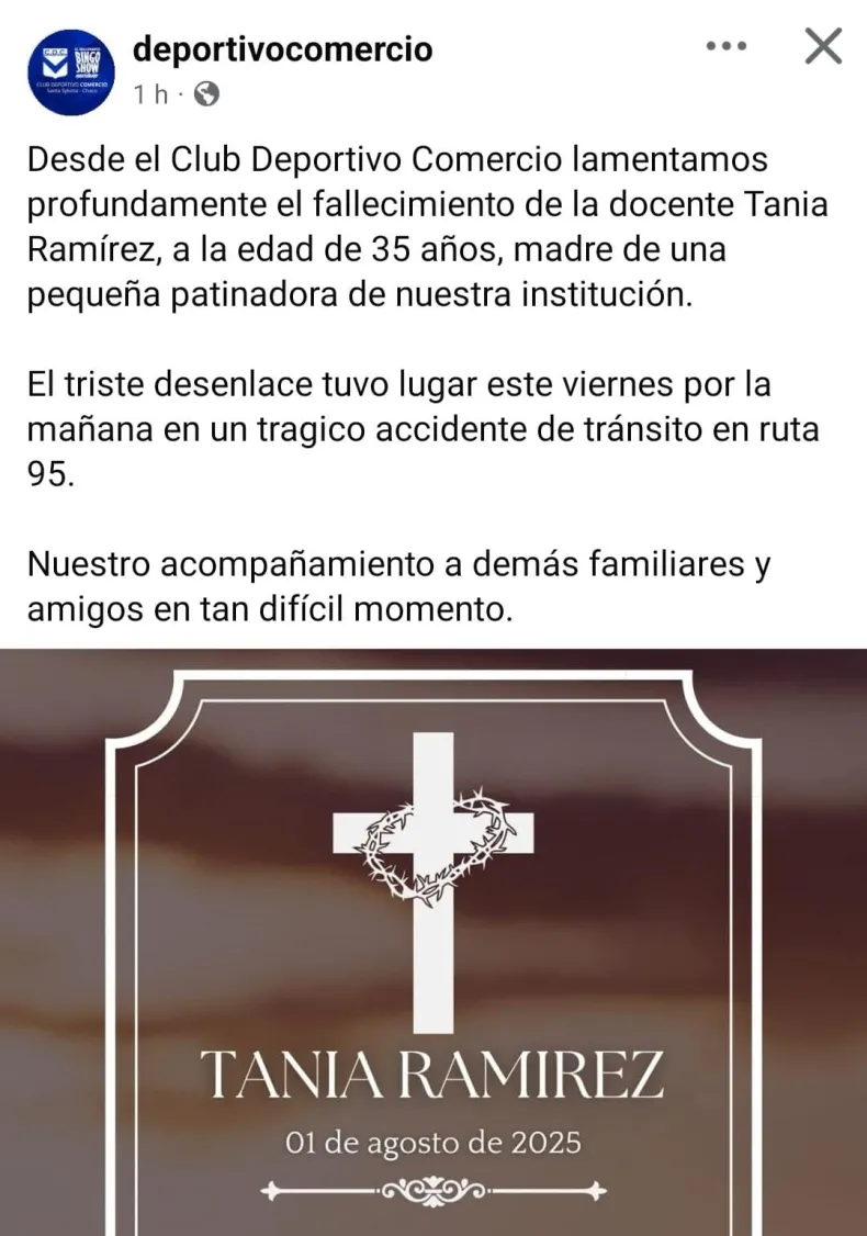 Desde el Club Deportivo Comercio, donde una de sus hijas practica patín, también expresaron su pesar: "Lamentamos profundamente el fallecimiento de la docente Tania Ramírez. Nuestro acompañamiento a los familiares y amigos en tan difícil momento".