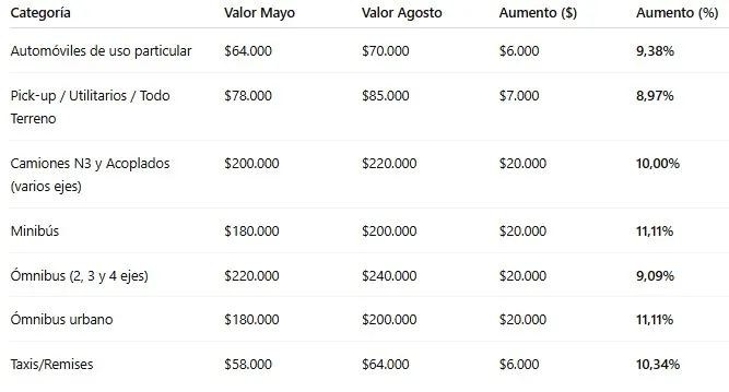 Con este incremento, el costo del servicio para vehículos radicados en la provincia parte ahora desde los $ 70.000. Los precios varían según el tipo de rodado y pueden llegar hasta los $ 220.000. Los nuevos valores comenzaron a regir desde el 1 de agosto.