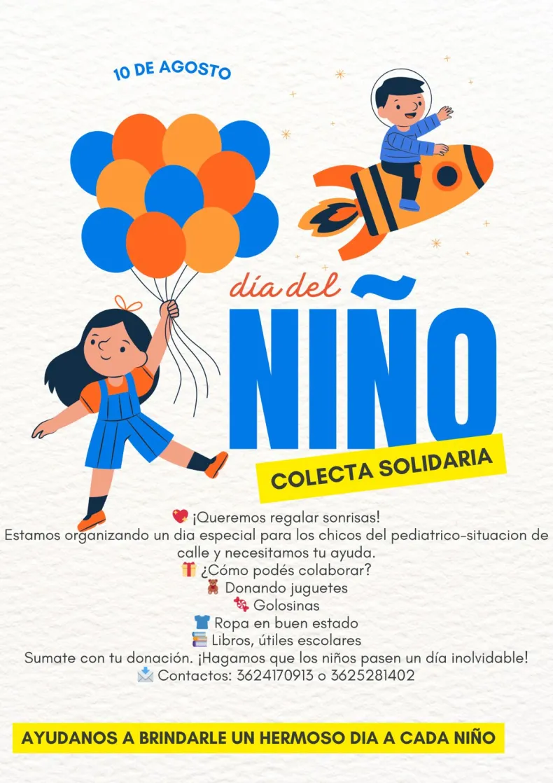 Las donaciones pueden incluir juguetes, golosinas, ropa en buen estado, libros y útiles escolares. Todo será clasificado y entregado en la jornada del 10 de agosto, en la ciudad de Resistencia. Quienes deseen colaborar pueden comunicarse a los números 3624170913 o 3625281402. "Ayúdanos a brindarle un hermoso día a cada niño", invitaron los organizadores.
