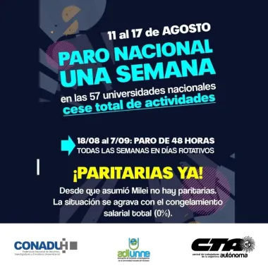 La Asociación de Docentes e Investigadores de la UNNE (ADIUNNE) llevará adelante una semana de paro total de actividades desde el 11 al 18 de agosto. Se trata de una medida convocada a nivel país, que se replicará en 57 universidades nacionales.