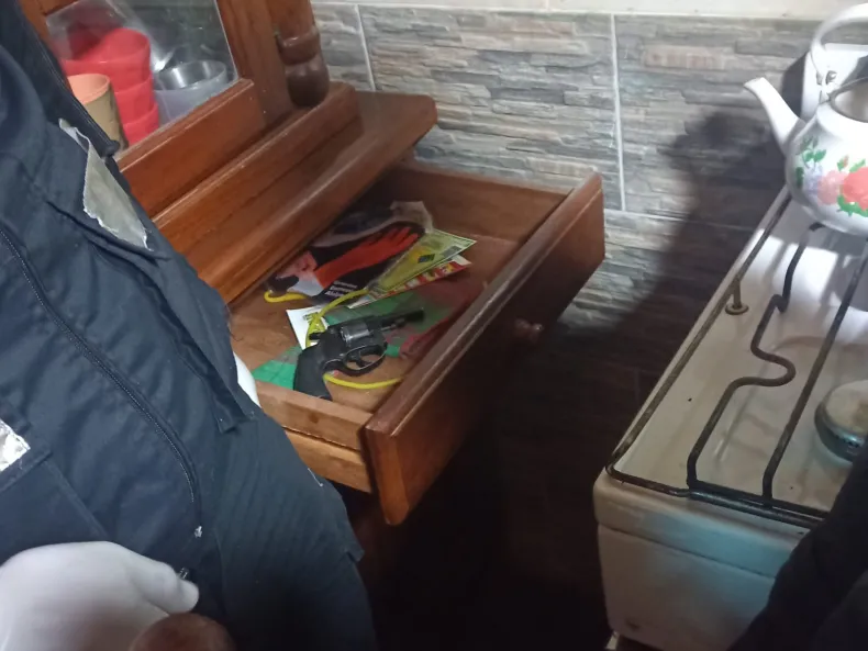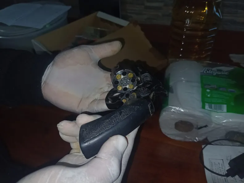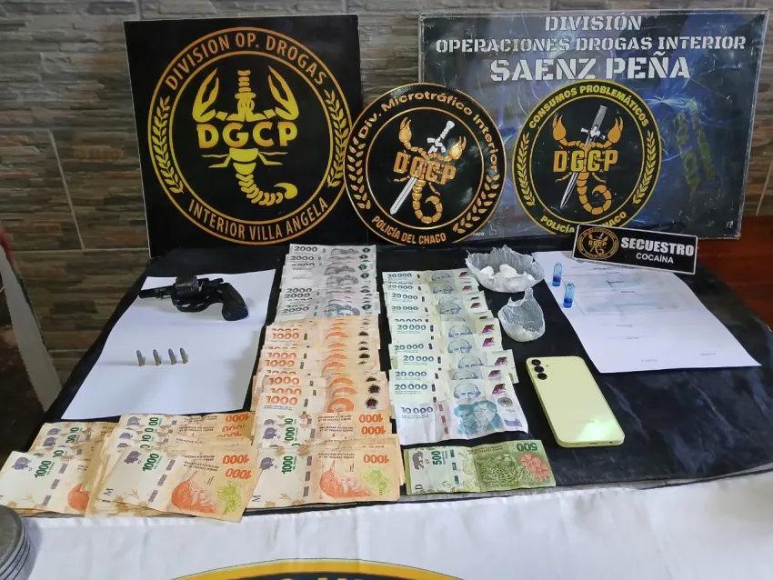 El primer procedimiento se realizó en calle Baigorria, entre Obligado y Álvarez Víctor, en Villa Ángela, donde fue detenido M.R.V, de 59 años. En el lugar se secuestraron dos envoltorios con 33 gramos de cocaína, $ 334.500, un teléfono celular Samsung A15 y, como secuestro impostergable, un revólver calibre 22 largo con cuatro cartuchos.