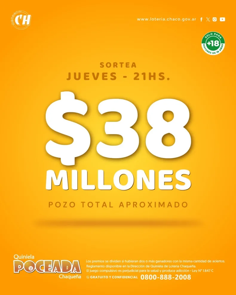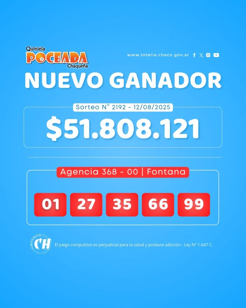 En el sorteo N° 2192 de la Quiniela Poceada Chaqueña, realizado el martes 12 de agosto a las 21 horas, un único apostador obtuvo el premio mayor de $ 51.808.121,38 al acertar los cinco números sorteados.