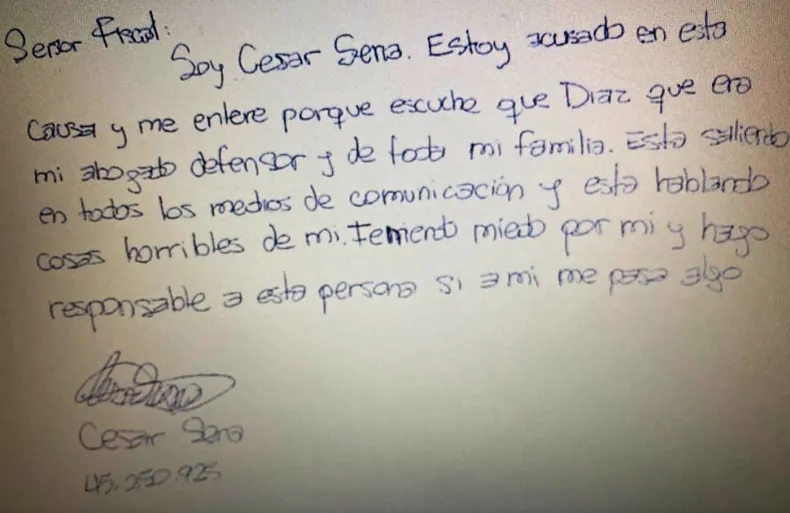 Agregó que la firma de Sena, ubicada a la izquierda y con cruces que mezclan nombre y apellido, "refleja arraigo familiar, falta de madurez y dependencia, rasgos que pueden influir en su comportamiento impulsivo". La grafóloga aclaró que su análisis aporta un perfil psicológico del autor de la carta, pero que la responsabilidad penal y la decisión final sobre la causa corresponden exclusivamente al juez.