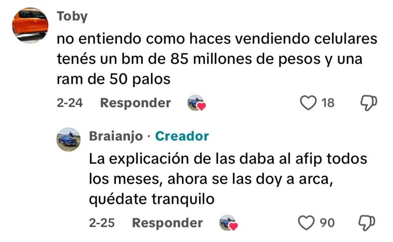 En una de las fotos publicadas por Obregón en sus redes sociales, mostró sus vehículos y recibió una peculiar pregunta de un internauta a comienzos del 2025: "No entiendo cómo haces vendiendo celulares, tenés un BM de 85 millones de pesos y una RAM de 50 palos", a lo que la respuesta no se hizo esperar y el propietario del comercio de celulares le retrucó: "La explicación se las daba a la AFIP todos los meses, ahora se las doy a ARCA, quédate tranquilo", contestó el empresario, ahora detenido.