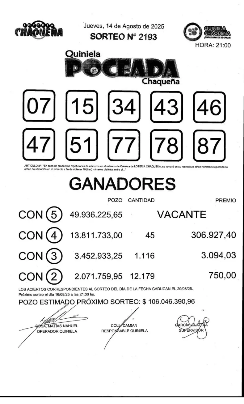 En el sorteo N° 2193 de la Quiniela Poceada Chaqueña, realizado el jueves 14 de agosto de 2025 a las 21:00, el premio mayor, correspondiente a quienes aciertan los cinco números, quedó vacante, acumulando un pozo de $ 49.936.225,65.