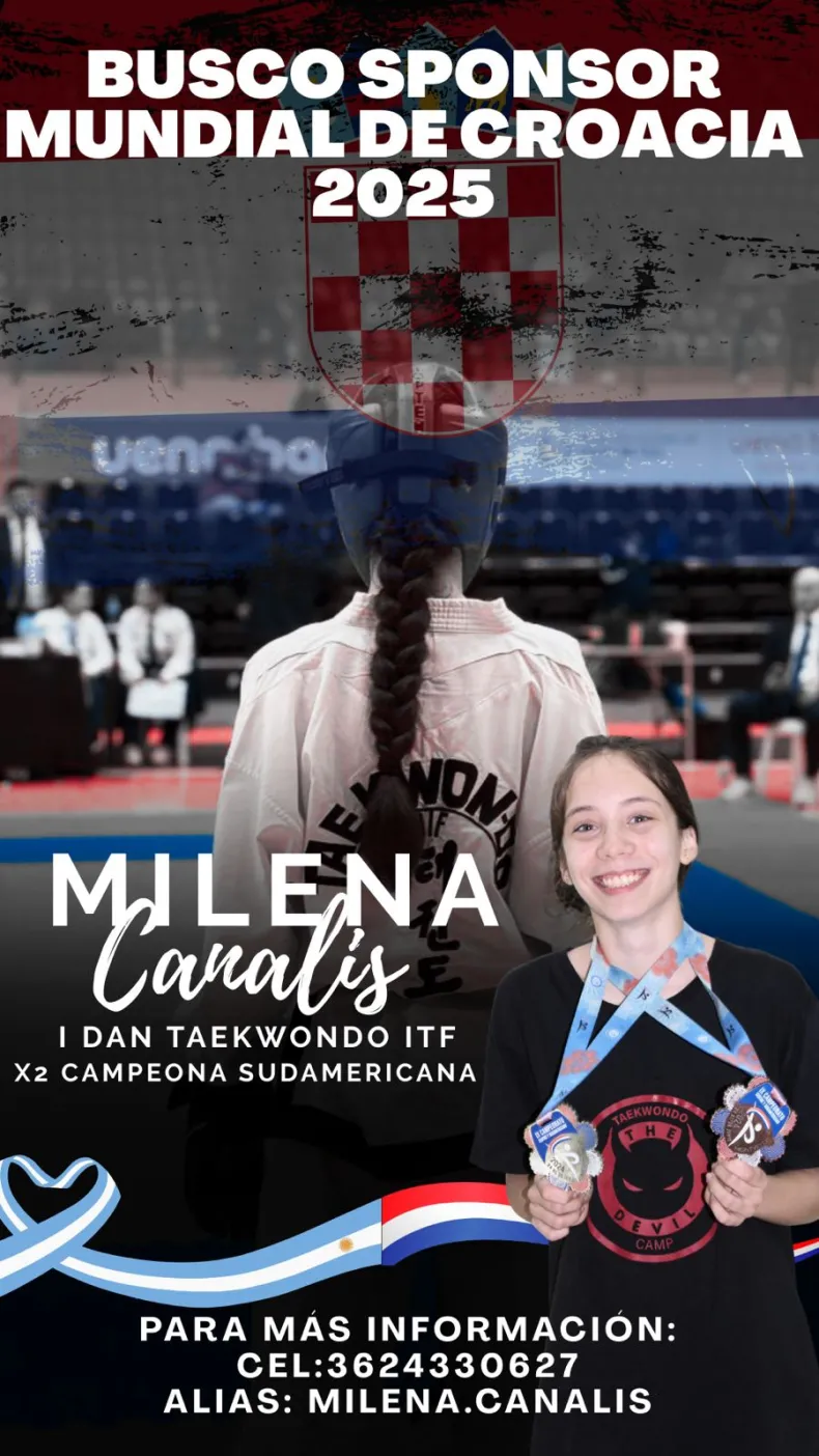 Milena Canalis tiene 12 años y desde los 5 practica Taekwondo ITF. En todos estos años logró destacarse en la disciplina, llegando a ser campeona Sudamericana en dos ocasiones en la categoría de Formas y Lucha. En este 2025 clasificó al Mundial de Croacia y para llegar allí está pidiendo la colaboración de la gente y de comerciantes como sponsors.