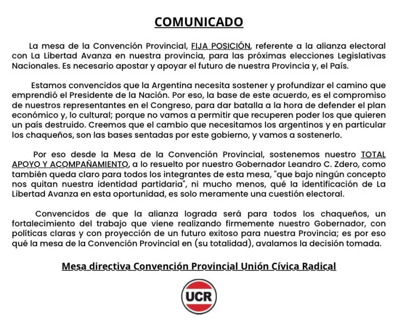 La mesa de la Convención Provincial de la Unión Cívica Radical brindó un comunicado en donde dejó en claro la postura respecto a la alianza electoral con La Libertad Avanza de cara a las próximas elecciones legislativas. En el texto plantearon: "Es necesario apostar y apoyar el futuro de nuestra Provincia y, el País".