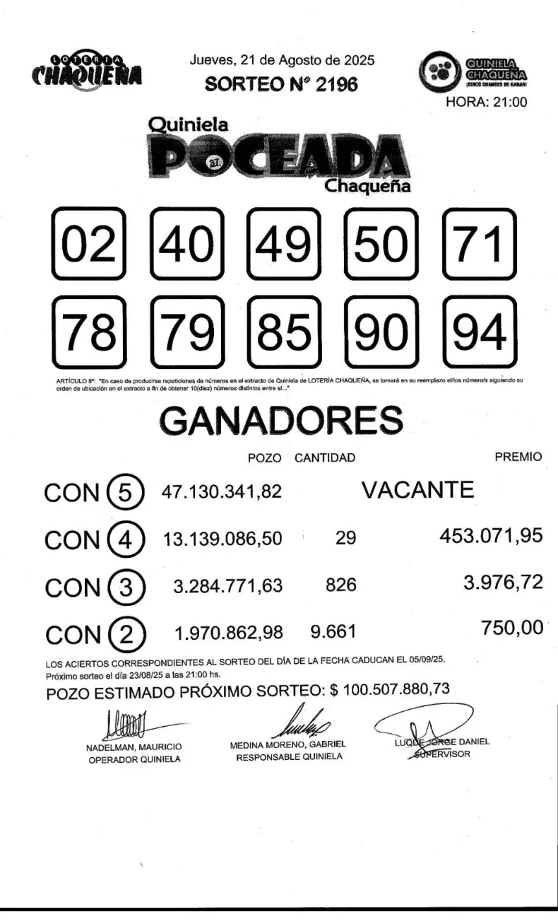 En el sorteo N° 2196 de la Quiniela Poceada Chaqueña, realizado el jueves 21 de agosto de 2025 a las 21 horas, no hubo ganadores con cinco aciertos, por lo que el premio mayor quedó vacante y se acumula para el próximo sorteo.