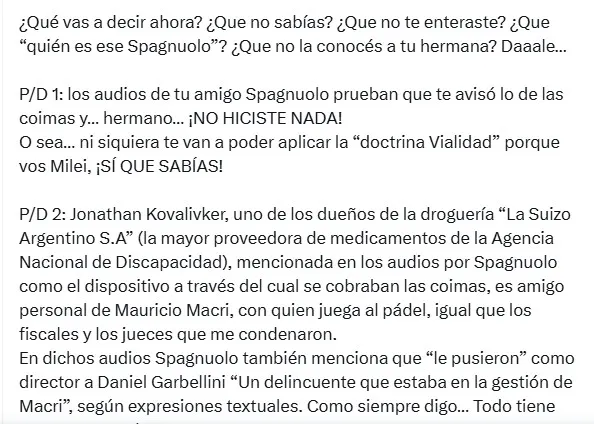 Como post data, destacó que los audios de Spagnuolo "prueban que te avisó lo de las coimas y… hermano… ¡NO HICISTE NADA! O sea… ni siquiera te van a poder aplicar la "doctrina Vialidad" porque vos Milei, ¡SÍ QUE SABÍAS!".