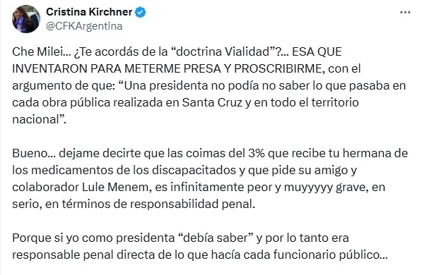 "Che Milei… ¿te acordás de la "doctrina vialidad"?... esa que inventaron para meterme presa y proscribirme, con el argumento de que: "Una presidenta no podía no saber lo que pasaba en cada obra pública realizada en santa cruz y en todo el territorio nacional", siguió CFK.