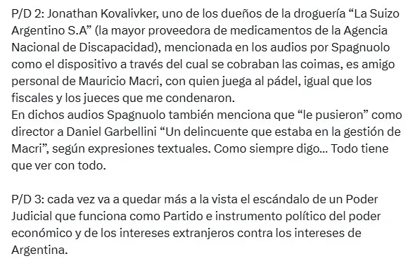 A lo que arremetió: "Jonathan Kovalivker, uno de los dueños de la droguería "La Suizo Argentino S.A" (la mayor proveedora de medicamentos de la Agencia Nacional de Discapacidad), mencionada en los audios por Spagnuolo como el dispositivo a través del cual se cobraban las coimas, es amigo personal de Mauricio Macri, con quien juega al pádel, igual que los fiscales y los jueces que me condenaron".