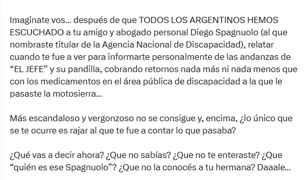 "Imaginate vos… después de que TODOS LOS ARGENTINOS HEMOS ESCUCHADO a tu amigo y abogado personal Diego Spagnuolo (al que nombraste titular de la Agencia Nacional de Discapacidad), relatar cuando te fue a ver para informarte personalmente de las andanzas de "EL JEFE" y su pandilla, cobrando retornos nada más ni nada menos que con los medicamentos en el área pública de discapacidad a la que le pasaste la motosierra", siguió.